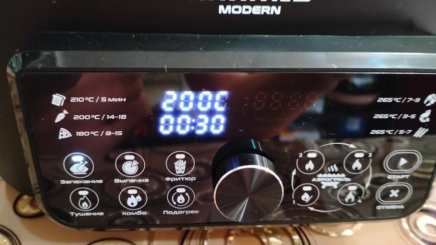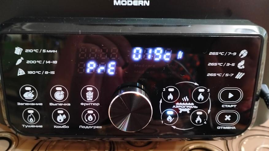Все эти режимы уже настроены на свои значения по умолчанию, и вы можете просто положить продукты внутрь аэрогриля и запустить нужную программу. Но если вам интересно поэкспериментировать, то придется открыть инструкцию и почитать о дополнительных настройках, таких как установка температуры, установка времени или вовсе настроить комбо- режим, благодаря которому можно быстро задать корочку продукту, а затем доводить его до готовности. Для всех этих настроек и нужен круглый регулятор в центре панели. Помимо регулятора и кнопок для выбора программ есть еще пара кнопок, старт для запуска выбранной программы и отмена, которая сбросит все настройки.