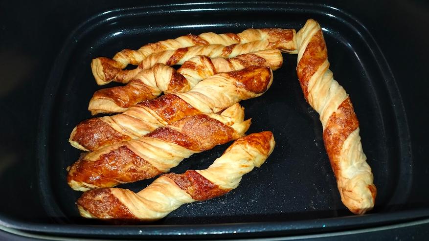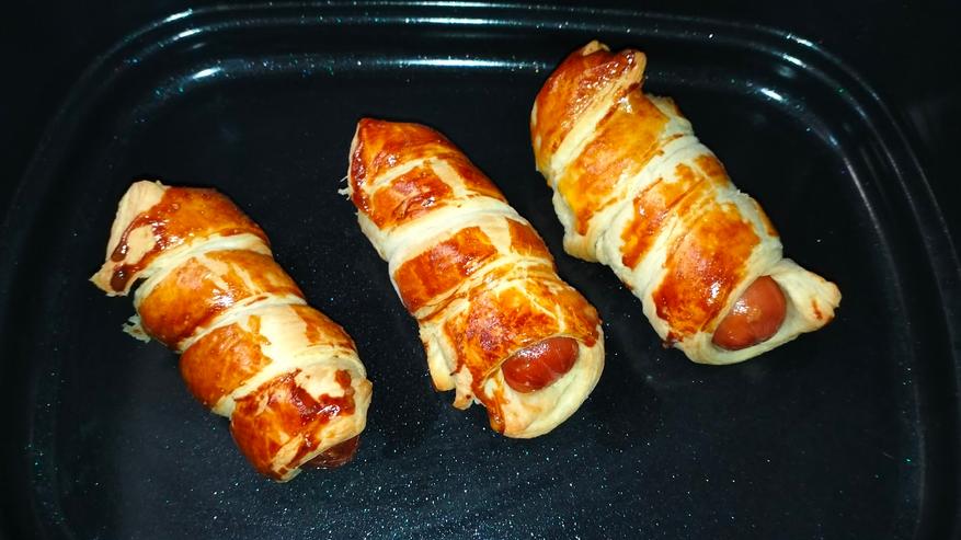 Осталось опробовать функцию выпечки. Особо выдумывать не стал, взял покупное слоеное тесто, замотал в часть сосиски, а другую просто свернул и все это обмазал яичным желтком. Программу выбрал автоматическую с соответствующим названием и по итогу получил вполне себе приятный продукт.