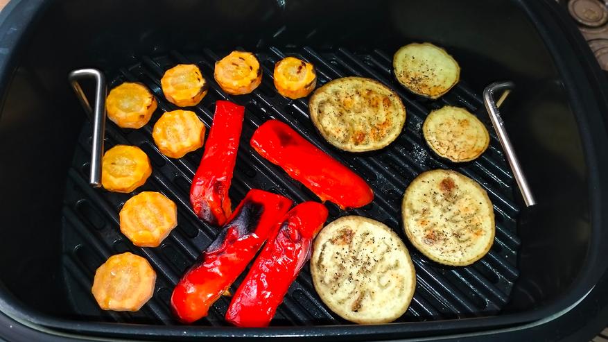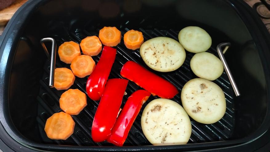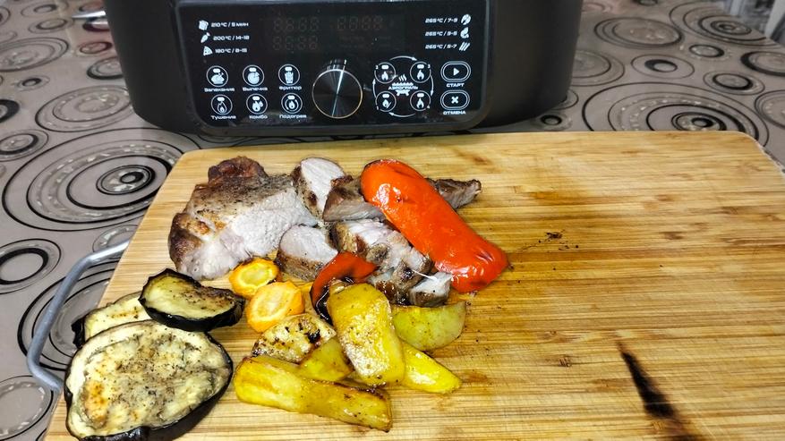 Обычно аэрогрили ассоциируются со здоровым питанием, кто я такой, чтобы спорить, проверим и на полезной пище. Нарезал овощей, выбрал режим «гриль 4» потому как на самом приборе справа есть изображение спаржи, а значит овощи должны готовиться именно так, 265 градусов и 7 минут после прогрева. Результат отличный.