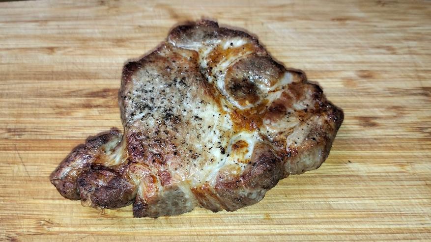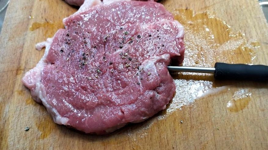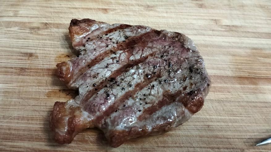 После того как стейк был помещен на решетку его приготовление заняло около двух минут, в это время можно было наблюдать на экране как стремительно растет температура внутри мяса, по рекомендации из инструкции для образования равномерной корочки с обеих сторон мяса я перевернул стейк, когда до финала оставалась пара градусов. Результат более чем устроил, мясо получилось равномерно прожаренным и с характерным для гриль- решетки рисунком.