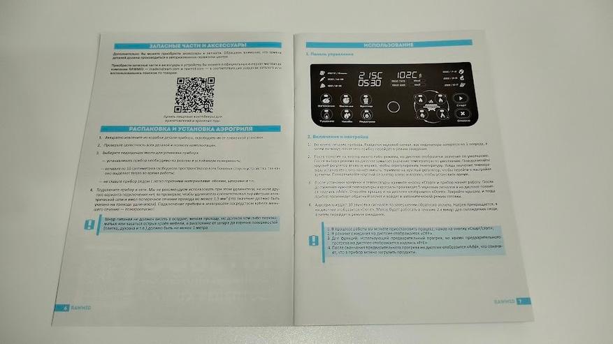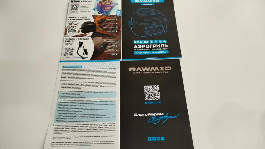 Помимо инструкции и гарантийного талона вы получаете еще пару рекламных буклетов. Гарантия выдается на 1 год, но ее можно расширить до 2 лет просто зарегистрировав товар на сайте. Инструкция- очень важна в данном случае, так как помимо основных принципов работы с устройством, прочитав ее вы узнаете и о том, как готовить тот или иной продукт. Функционал данной модели действительно велик и в инструкцию просто не стали добавлять все, что можно приготовить, а добавили всего пару рецептов для общего понимания что и где нужно настраивать.