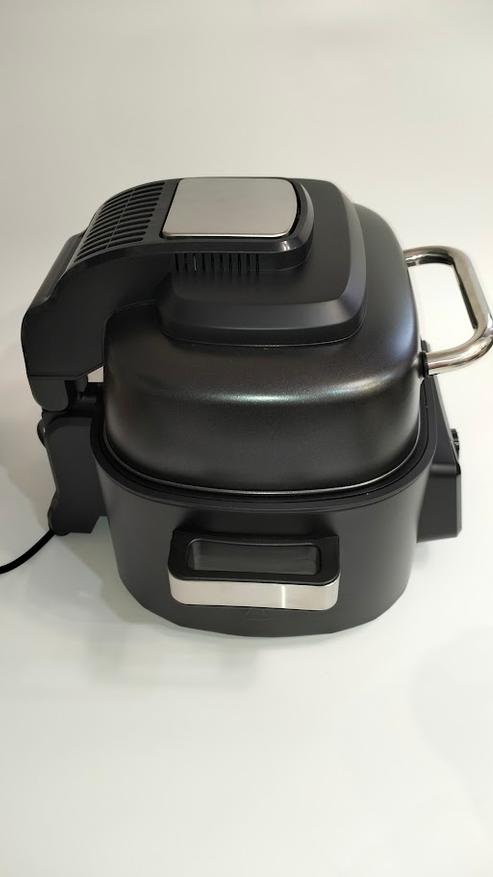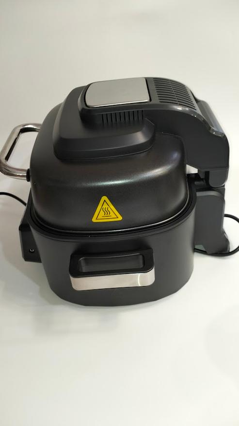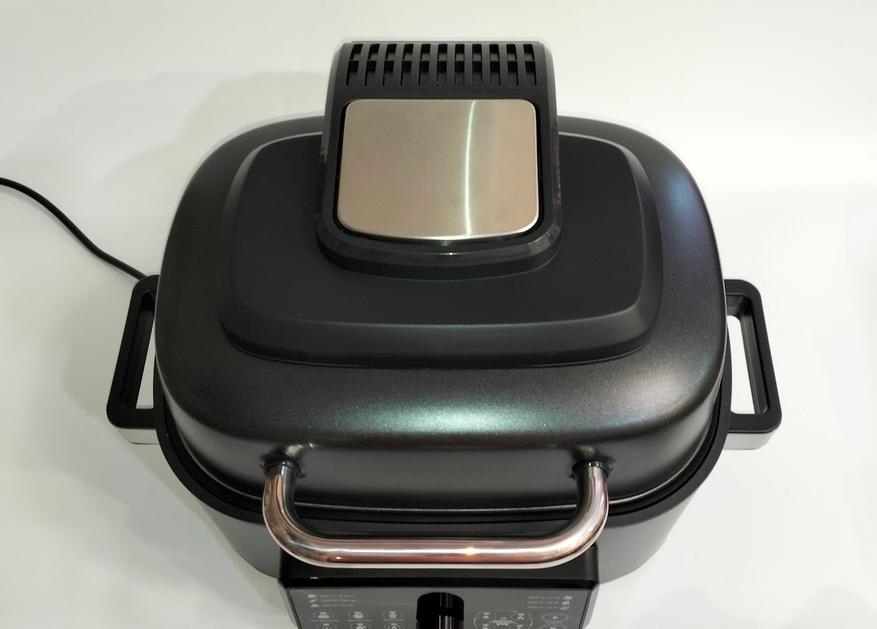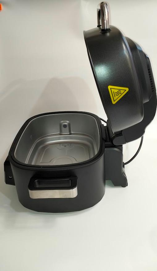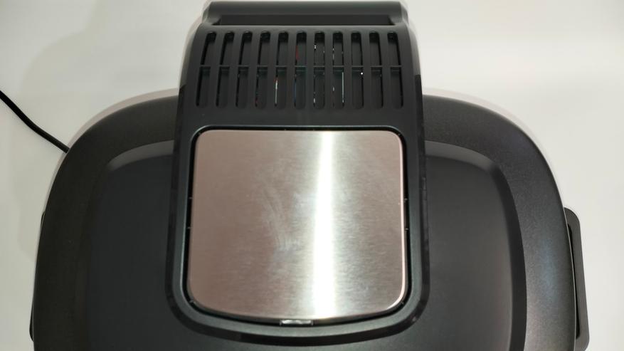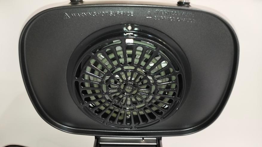 Для интенсивной циркуляции воздуха в верхней крышке интегрирован большой многолопастной вентилятор. В сочетании со сквозной решёткой гриль и обтекаемой формой чаши он создаёт продуманную систему продува: горячий воздух поступает не только сверху, но и со всех боковых сторон. Благодаря этому блюда равномерно прожариваются со всех сторон, приобретая аппетитную корочку и сохраняя сочность внутри.