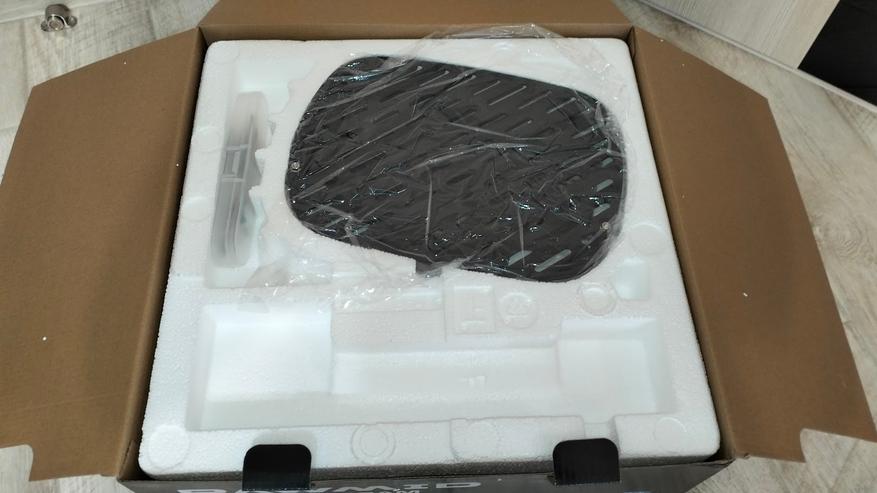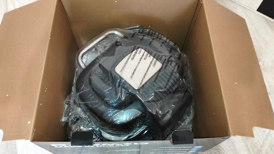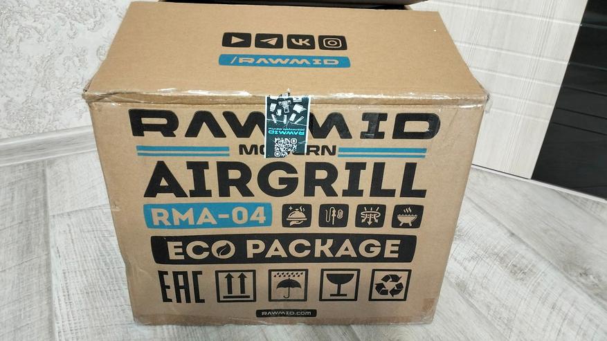 Внутри этой коробке вы обнаружите уже более красочную коробку, внутри которой находится сам аэрогриль, который зажат двумя пенопластовыми вставками и дополнительно упакован в целлофан. Сверху лежит гриль- решетка.