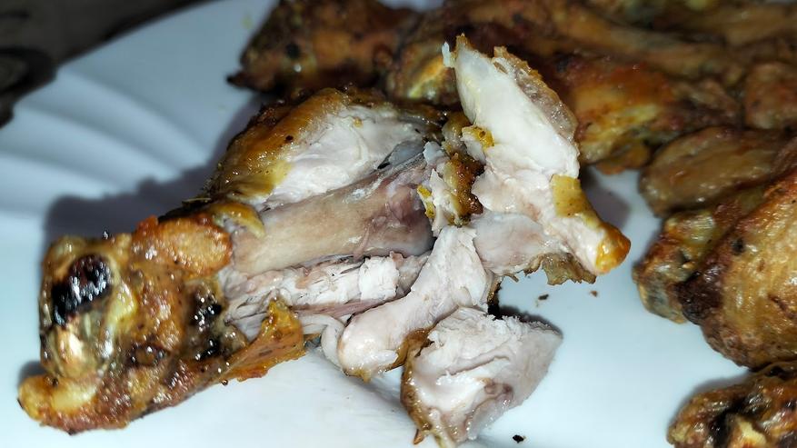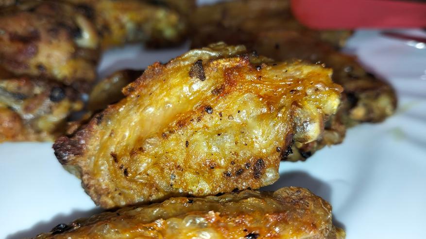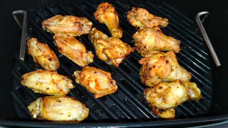 Далее было решено запечь куриные крылья. Обычно это пара подложек, потому как зачем нагревать и грязнить духовку ради десятка крыльев, а пара подложек это 22 крыла разделенных на 2 части (3 фалангу не использую), а потом съедается треть, на завтра еще треть, а потом они уже и надоели. В данном случае, с аэрогрилем, на решетку комфортно помещается 6 крыльев, а точнее 12 половинок, которых более чем достаточно на один раз. Программа была выбрана автоматическая, при которой температура составляет 200 градусов, а время 30 минут. Не забываем про предварительный прогрев. Спустя 15 минут готовки я перевернул крылья, хотя в данном случае этим можно было вполне пренебречь. Результат- полностью готовые крылья с золотистой корочкой, но как мне показалось немного пересушены, время можно уменьшать до 20 мнут.