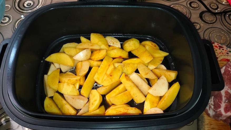 Задумка проста, мясо будет готовиться примерно половину того времени, которое понадобится на приготовление картофеля, поэтому будет две закладки мяса с перерывом на прогрев, так как после каждой завершенной программы прибор запускает прогрев, не забываем про извлечение продуктов на это время. Итак, после прогрева вниз в чашу выкладываю картофель, а сверху первую партию мяса и после завершения первой программы повторяю процедуру.
