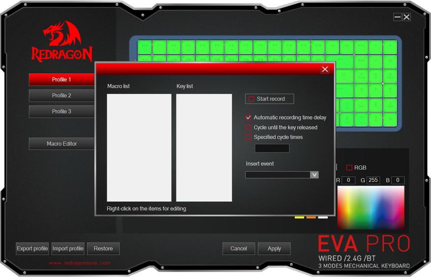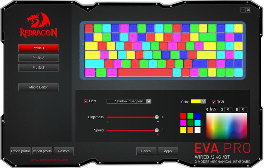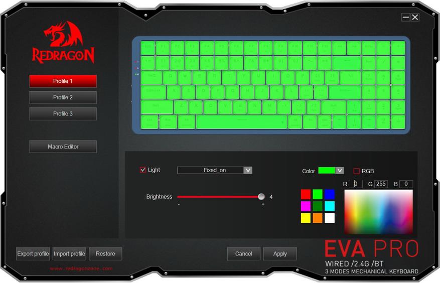 С официального сайта можно скачать ПО для данной модели клавиатуры. Возможности самые базовые — можно сохранять и загружать профили с настойками, с удобством настаивать подсветку, а также записывать макросы.