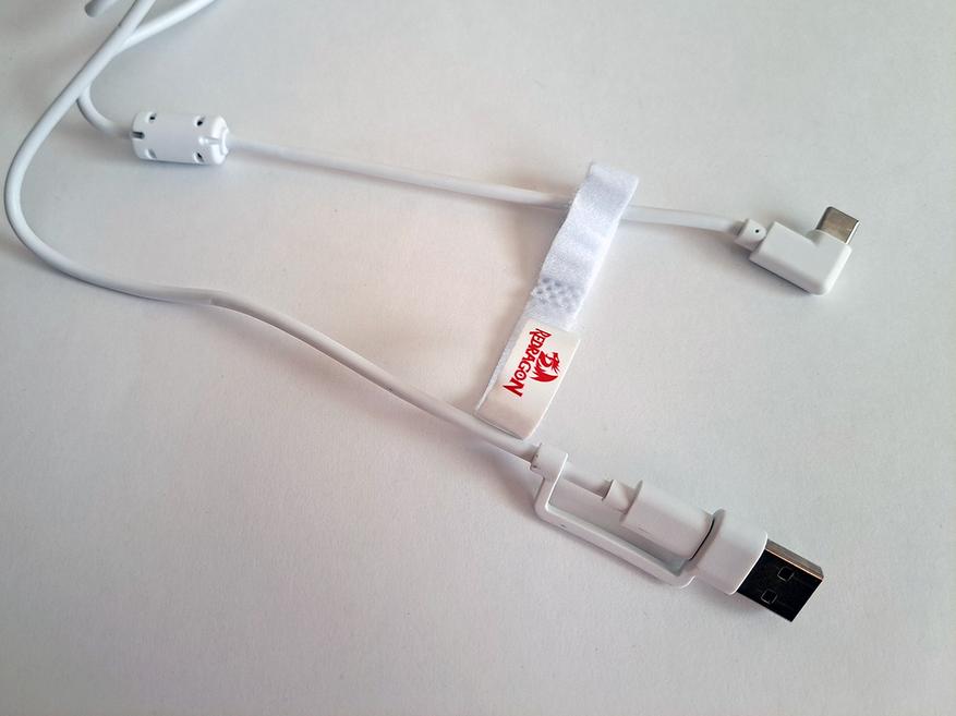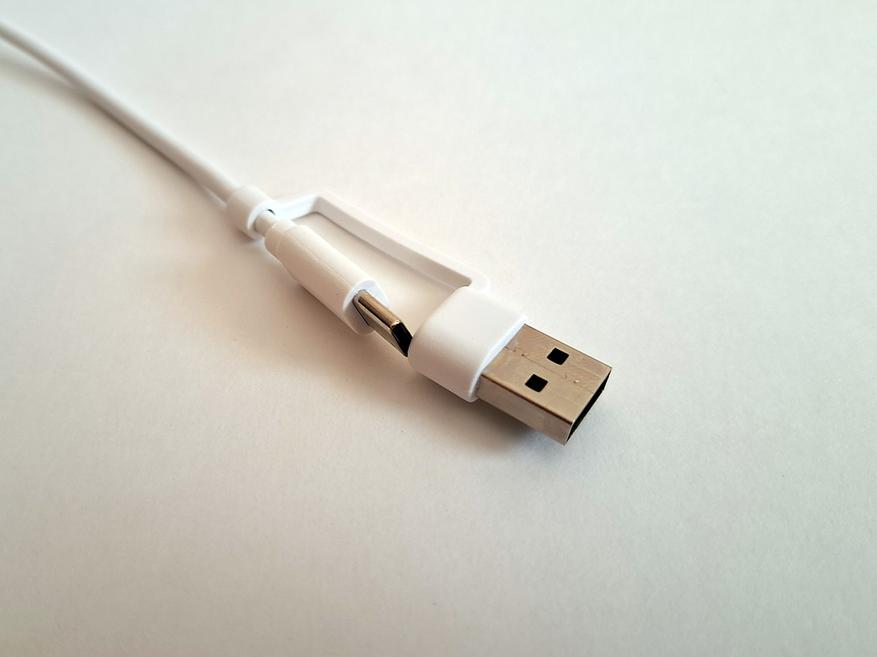Длина USB кабеля 150 см. В принципе, это кабель с разъемами USB Type С и встроенным переходником на USB Type A. На кабеле есть ферритовый фильтр для борьбы с помехами, и велкро-утяжка для регулировки длины.