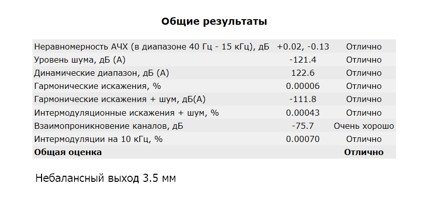 Как видите, отличная кривая АЧХ, высокий динамический диапазон, шумы на минус 156 дБ, а искажения, составляют всего 0.00006% с уровнем в минус 132 дБ. На небалансном выходе тоже достойно — минус 130 дБ.