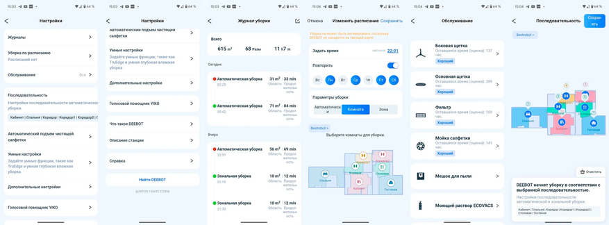 - разные типы поведения на коврах: повышение мощности, подъем салфеток, объезд и влажная уборка на ковре;