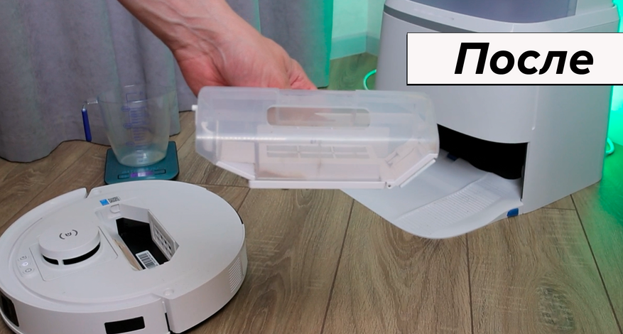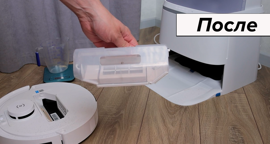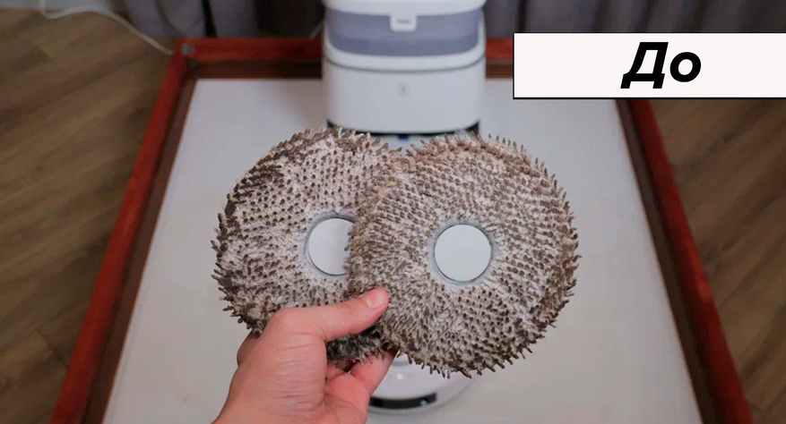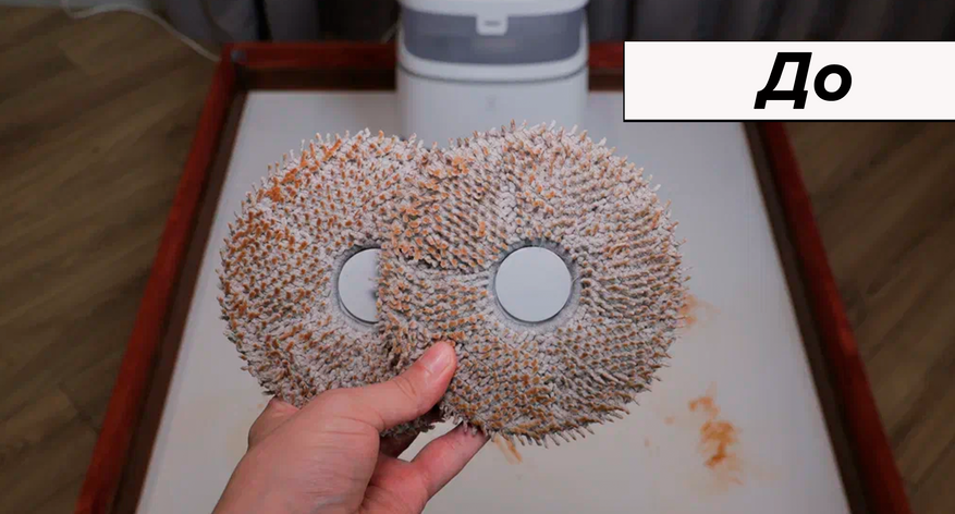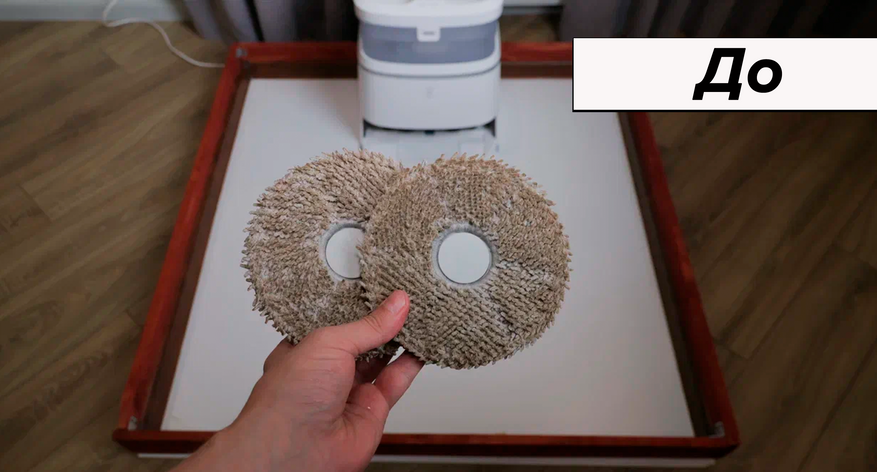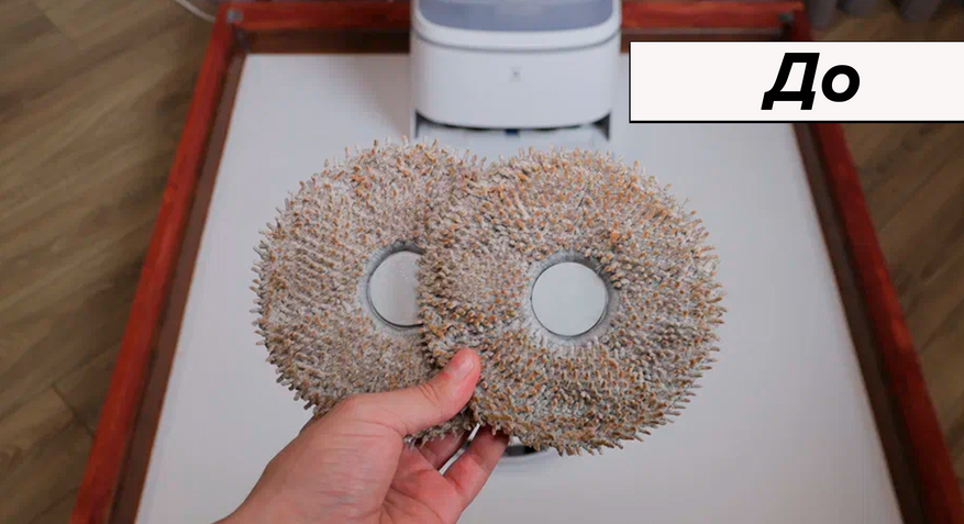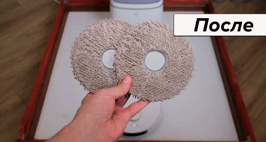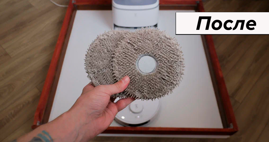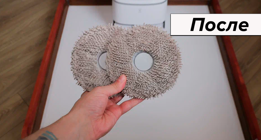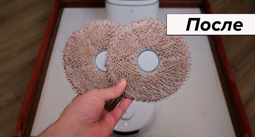 Для полоскания салфеток станция греет воду и расходует до 350 мл. Такого подхода хватает для самоочистки после ежедневной уборки, после отмывания отпечатков лап питомцев. Промывка после экстремальных тестов делает мопы заметно чище, но это лишь на первый взгляд. При ручной стирке из них удаётся вымыть ещё немало грязи.