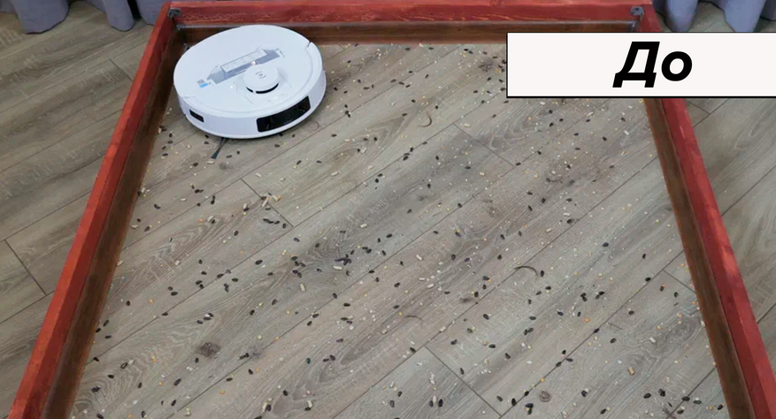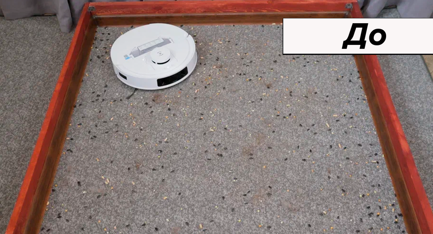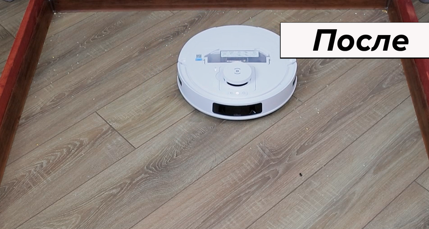 У песка разлёт существенно меньше, чем у крупных соринок, поэтому и собрать удалось больше — 95%. Отчасти этого удалось добиться и за счет более качественной обработки углов. Deebot T30 Pro Omni оставляет соринки лишь в 15-мм зоне на стыке плинтусов (средний результат у аналогов — 20 мм).