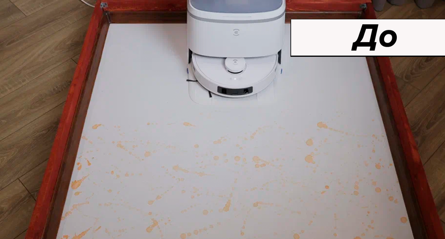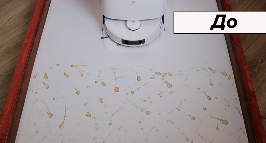 Интенсивность смачивания салфеток из встроенного бачка средняя. Чтобы отмыть присохшее кофе, роботу понадобилось 2 прохода. С соком справился быстрее — 1 проход.