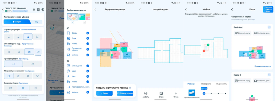 - редактирование границ комнат, выделение целевых зон для уборки разного типа, а также зон, куда роботу заезжать не следует;