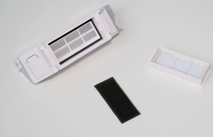 Сверху — съемная крышка, под которой прячется пылесборник объемом 275 мл. Он маленький, но пылесос периодически заезжает на станцию, чтобы выгрузить мусор. Фильтрация тройная, что сегодня встречается не часто: помимо НЕРА-фильтра, есть два фильтра предварительной очистки (сетка и прокладка).