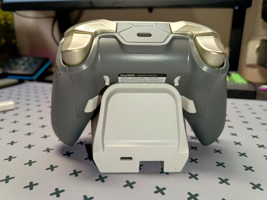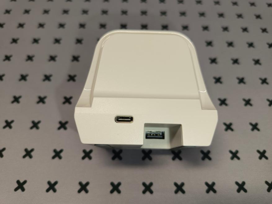 Док-станция для геймпада весит всего 150 граммов и имеет противоскользящие накладки на дне. Геймпад крепится к ней с помощью четырех прижимных контактов и удерживается магнитами для дополнительной надежности. В задней части док-станции расположены разъемы: USB-A для подключения донгла и USB-C для компьютера. Этот донгл выполняет сразу две функции: удлиняет кабель и служит зарядной станцией. Такое решение очень удобно, так как экономит один USB-порт на компьютере.
