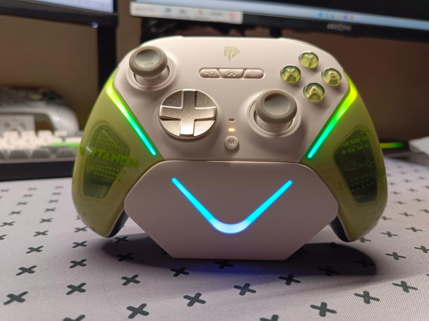 Подсветка есть у геймпада на передней панели и у док-станции. Если снять геймпад с подставки, подсветка на док-станции гаснет. Подставка не только служит украшением, но и заряжает геймпад. У подсветки есть несколько режимов работы и цветов, а при желании можно её полностью отключить.
