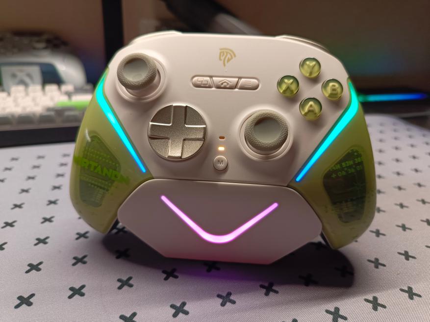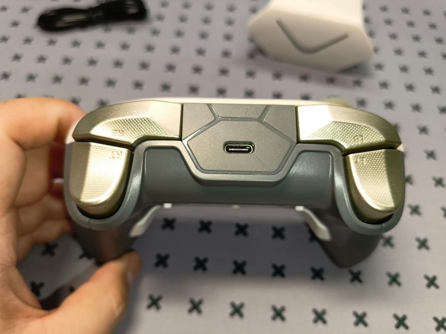 К минусам я бы записал, что нет никакого софта для настройки. Конечно, он здесь особо и не нужен, с одной стороны, так как всё можно сделать через горячие клавиши, но через приложение удобнее. Не поддерживает также KeyLinker. Также чисто субъективное мнение — эта подсветка несет более декоративный эффект, нежели смысловой, так как подсвечивается корпус, а не сами кнопки. И напоследок. В комплекте также идет черный кабель. Все остальные элементы — геймпад, донгл и док-станция — белого цвета. Было бы логичнее, если бы кабель тоже был белым.