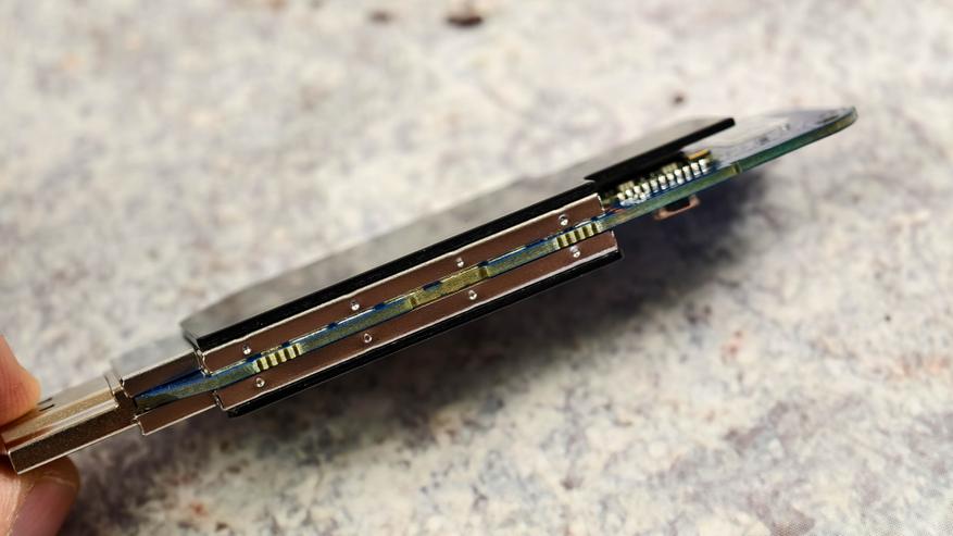 Компоненты с обеих сторон закрыты металлическими экранами, поверх которых наклеены дополнительные пластины для лучшего охлаждения.