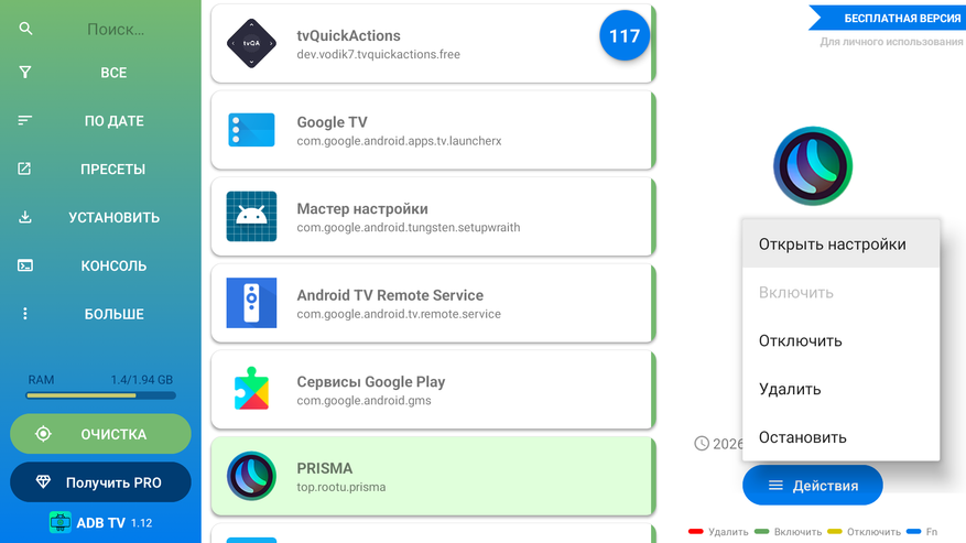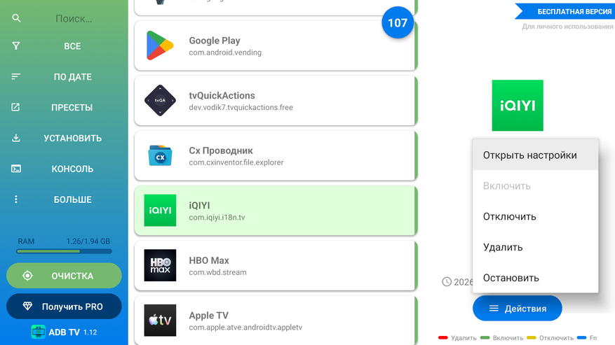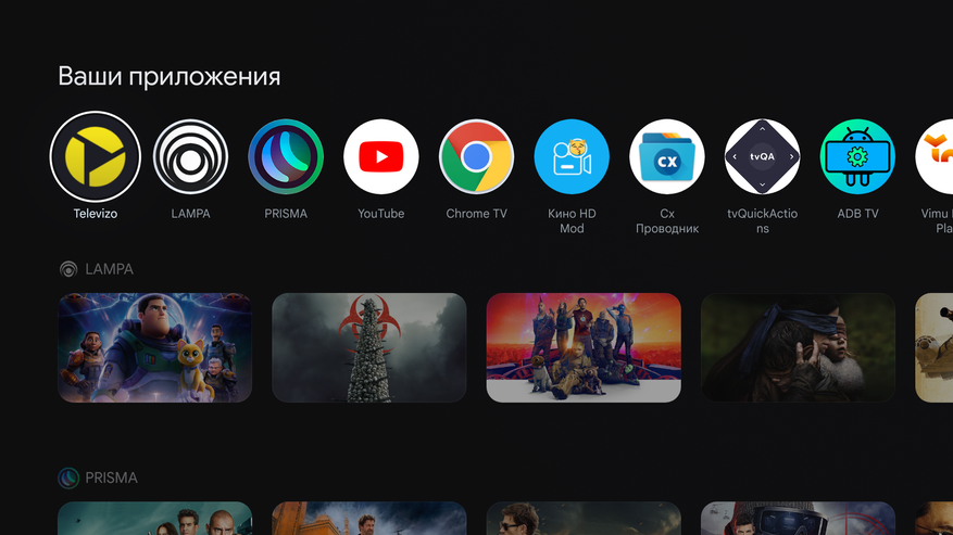 Стик работает на Google TV и позволяет настроить порядок ярлыков на главном экране, а вот порядок каналов с рекомендациями в самой системе изменить нельзя. Но можно изменить при помощи сторонних приложений. Первым делом устанавливаете с магазина ADB TV: App Manager. В нем удаляете все приложения, которые вам не нужны. Удаляются даже те, которые нельзя удалить обычным методом (все вот эти iQIYI, Prime Video и прочие англоязычные сервисы). Вместе с приложениями удаляются и их каналы с рекомендациями. После того как почистите ненужное, можно поменять порядок каналов одним хитрым способом. Допустим вы не хотите, чтобы вторым в списке был TorServe — история, который система туда втулила по непонятной никому логике, а хотите передвинуть туда лампу. Заходите в ADB TV, выбираете TorServe и в выпадающем списке нажимаете отключить. Приложение отключается и исчезает с главного экрана (вместе с каналом), но не удаляется. Потом снова нажимаете включить и оно снова появляется. Но его канал с рекомендациями уже будет в самом низу, а на его место поднимется канал, который был следом за ним. Ну и путем таких рокировок можно выставить любой порядок каналов. Можно даже сделать проще: все поотключать, а потом включать в нужной очередности.