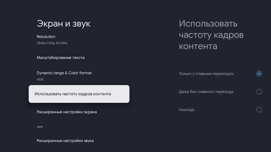 Посмотрим на настройки, они же покажут и основные возможности устройства. Нас в первую очередь естественно интересует раздел «экран и звук» и сюда для чего-то засунули HDMI-CEC, который ни к экрану, ни к звуку отношения не имеет. Приставка его поддерживает и это конечно плюс. По выводу изображения: поддерживается разрешение до 4К и частоты от 23,98 до 60 Гц. И цельные и дробные. И конечно же присутствует автоматическое переключение частот в зависимости от конетента (автофреймрейт). Автофреймрейт программный, то есть работает только в приложениях, которые его понимают: плееры ViMu, KODI или Just Player, а также TiviMate для просмотра IPTV.