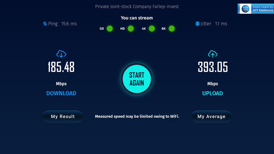 Также проверил скорость WiFi, ведь по сути это единственный способ выхода в интернет и все в этом стике осуществляется через него. Проверил дважды. Если роутер в одной комнате, то получил 185 Mbps на скачивание и 393 Mbps на отдачу. Почему-то в обратную сторону скорость почти в 2 раза выше, хотя нам конечно важнее прием (скачивание). Если роутер разместить подальше, в начале квартиры, добавив преграды в виде 2 стен, то получим: 125 Mbps на скачивание и 302 Mbps на отдачу. Даже в таких условиях скорость отличная и приставка легко потянет даже 4К HDR с высоким битрейтом через Torrserve.