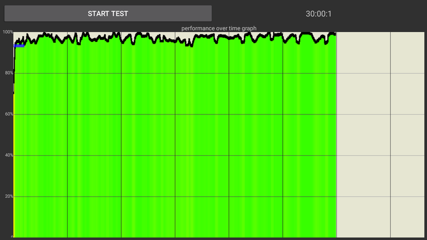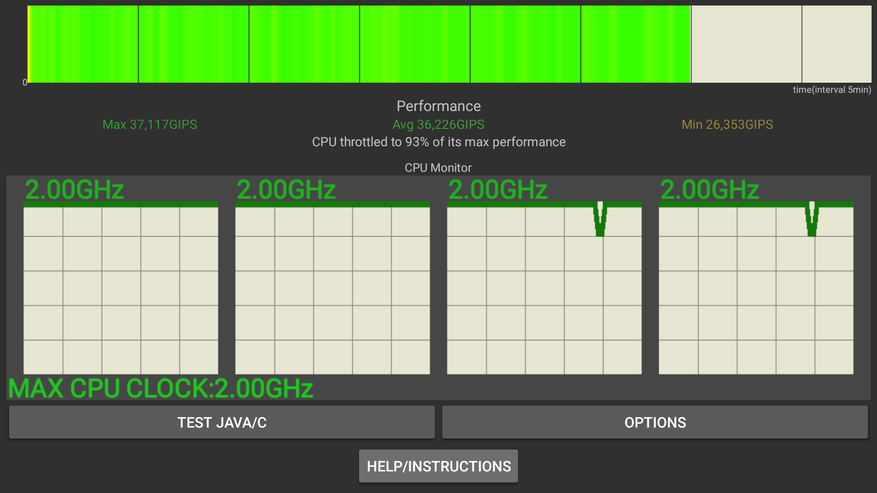 Гораздо важней, как устройство ведет себя под нагрузкой и для этих целей я провел 30 минутный троттлинг тест (100 потоков). Падение производительности оказалось незначительное, средняя производительность на уровне 93% от максимально возможной и составляет 36,226 GIPS. Корпус приставки нагрелся до 47 градусов во время теста. Какая температура на процессоре — не известно, температурных датчиков здесь нет. Но не думаю, что слишком высокая, ведь используется маломощный, холодный процессор с мизерным потреблением.