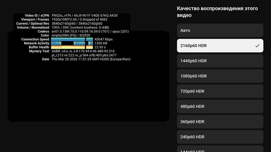 Разумеется все было проверено в обычном использовании. Телевизор автоматически переключается в HDR режим, многоканальный звук работает, все современные кодеки поддерживаются (в том числе AV1).