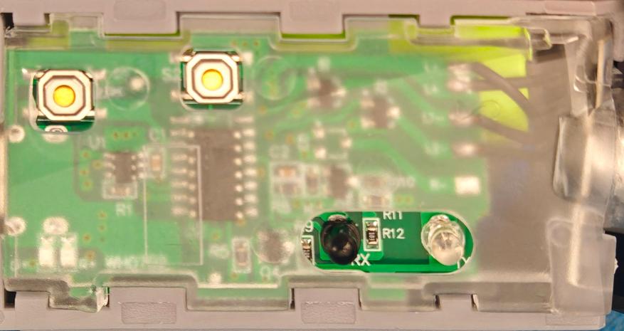 Справа на корпусе расположены две кнопки, индикатор и оптический датчик жестов. Кнопка, отвечающая за включение и переключение режимов находится на краю корпуса — её проще нащупать. Чуть ближе к центру находится кнопка, переключающая режим управления жестами. Если её активировать (меняется цвет светодиода), можно будет изменять режим, просто поднеся руку к датчику или приловчившись махать справа у головы. Для меня такое управление сложнее, требует сноровки, но позволяет при работе освободить обе руки.