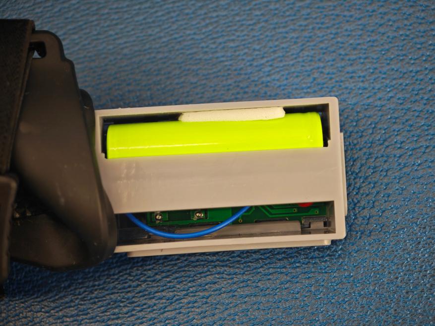 Практически весь корпус фонаря закрыт резинкой (она снимается, но полностью избавиться от нее мешают провода к COB-полоске). На фотографии хорошо видно оптический датчик (светодиод и фотоприемник). Внутри припаяна литиевая перезаряжаемая батарея (тип 14500, по размерам как «пальчиковая», только с рабочим напряжением 3.7V). Маркировка на батарее отсутствует.