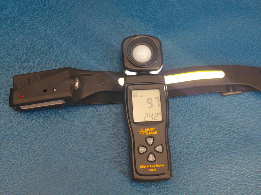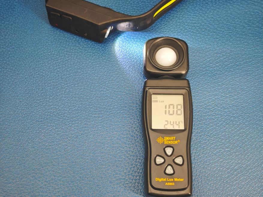 Мой замер показывает несколько меньшие значения, чем заявляет разработчик. Предполагаю, что это значение сильно зависит от качества перезаряжаемой батареи и от уровня её заряда, а также (возможно) от партии к партии гибких COB-панелей. Измерено 100 LX в основном режиме, 30 LX в половинном режиме, и аналогичные значения для бокового фонаря с рассеивателем.