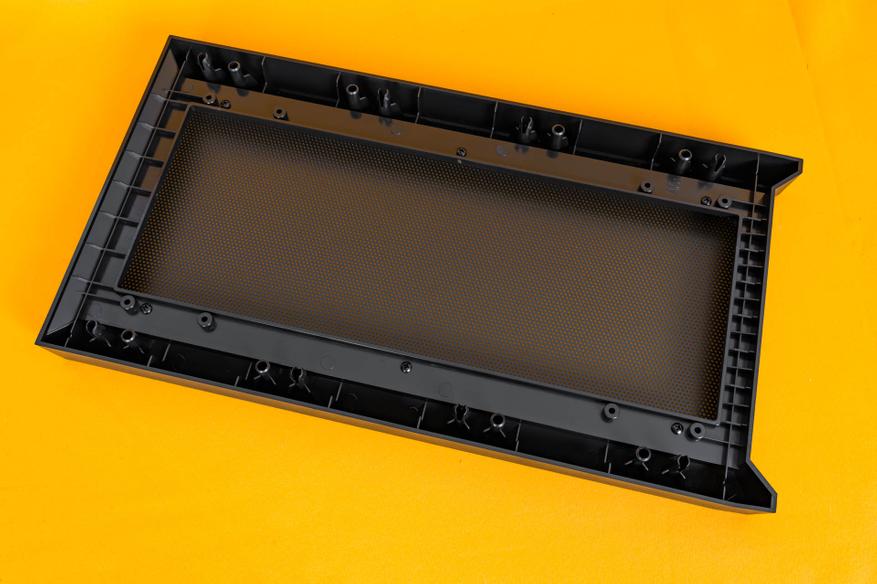 Лицевая панель представляет из себя две части. Внешняя металлическая деталь, большую часть площади которой занимает сетка с небольшими отверстиями, они не позволяют крупному мусору попасть внутрь корпуса. Внутренняя часть, выполненная из пластика, крепится к раме корпуса с помощью специального соединения (паз/шип). Внутри лицевой панели и за ней не предусмотрено пылевого фильтра, что на мой взгляд является минусом, так как мелко фракционные части мусора и пыли будут залетать внутрь корпуса.