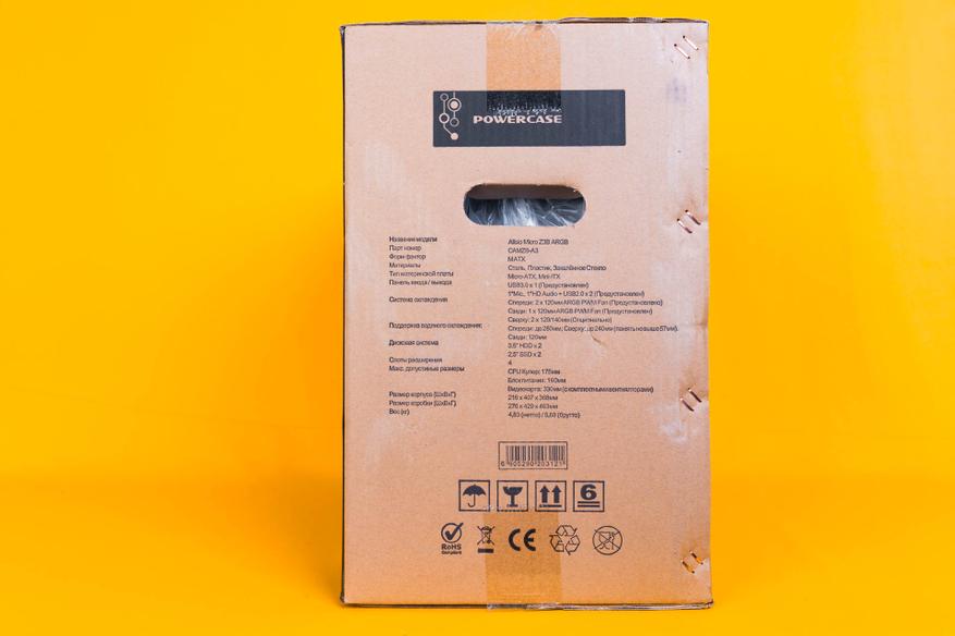 PowerCase Alisio Micro Z3B ARGB поставляется в коробке, изготовленной из переработанного картона — чтобы не увеличивать конечную цену для покупателя. На коробку нанесено схематичное изображение Alisio Micro Z3B и перечислены технические характеристики. Все надписи и изображения выполнены чёрной краской.