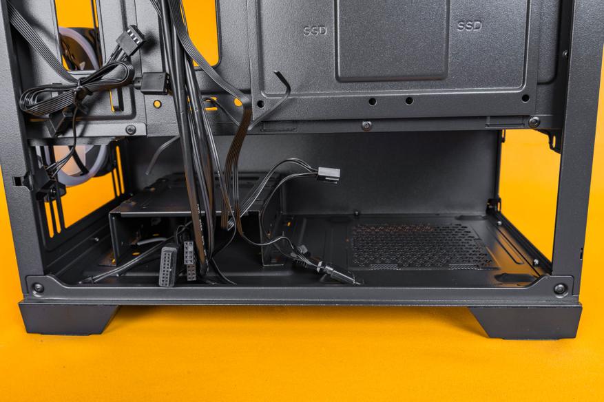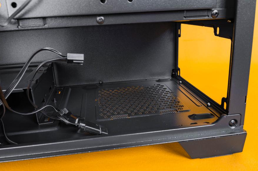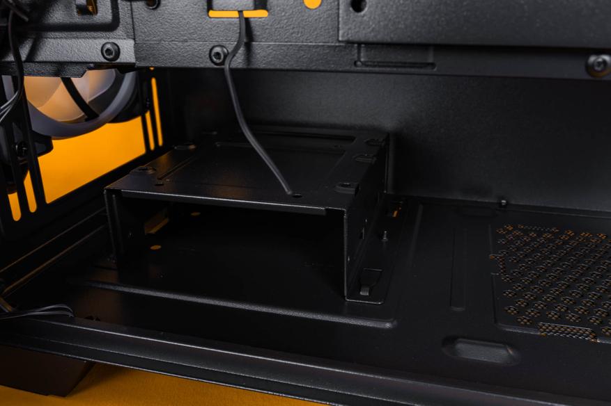 Внизу корпуса есть съемная корзина для жестких дисков, но, к сожалению, под блоком питания отсутствуют мягкие демпферы, которые могли бы снизить вибрацию.