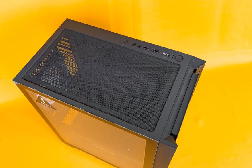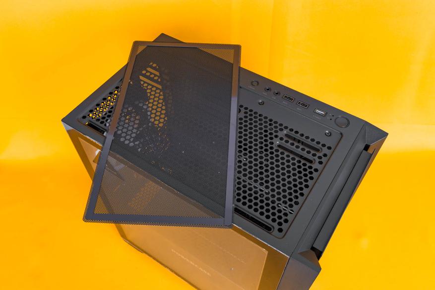 Большую часть верхней части корпуса Alisio Micro Z3B ARGB занимает пластиковый пылевой фильтр, который расположен в небольшом углублении с вентиляционными отверстиями и направляющими для установки систем охлаждения.