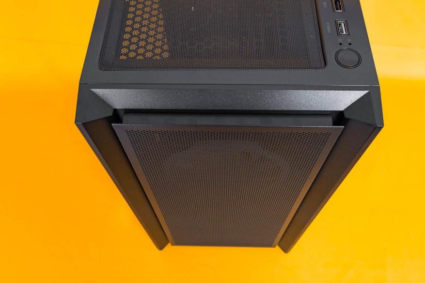 На верхней части кожуха блока питания располагаются закольцованные отверстия под различные кабели, предусмотрены места крепления 2 х 120 мм вентиляторов, а также имеется закольцованное отверстие для удобной установки систем охлаждения на лицевую часть корпуса.