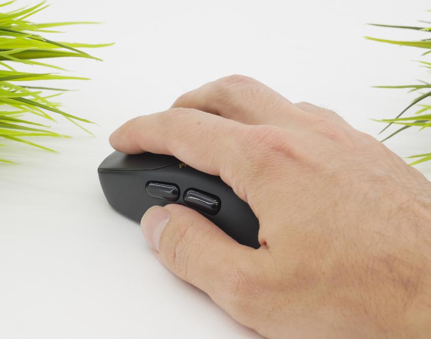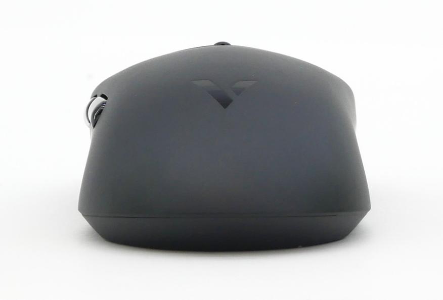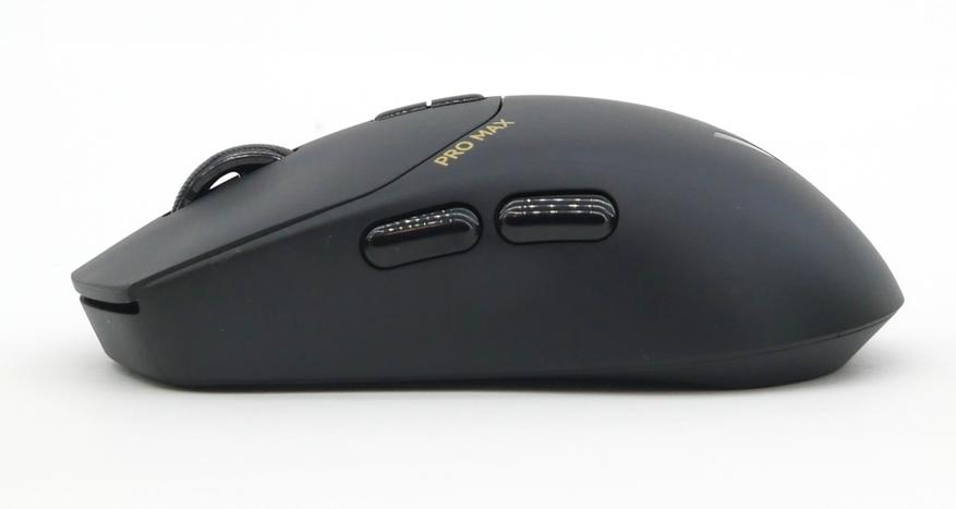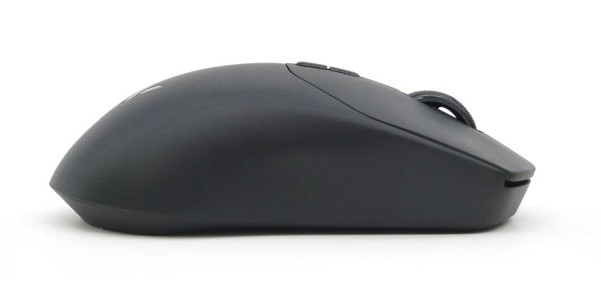 При прямом ракурсе можно заметить главный порт подключения и подзарядки — USB Type-C. Rapoo VT1Pro Max можно использовать и в беспроводном режиме на радиоканале 2,4 ГГц. Емкость аккумулятора заявлена на отметке 800 mAh, и «жизнь» на одном заряде составляет, по заверению разработчиков, до 200 часов, что бывает оптимистично, но нередко бывает близко и к правде. Шероховатый пластик всего корпуса граничит с прорезиненным колесом прокрутки и четырьмя дополнительными кнопками из глянцевого пластика. Само устройство немаркое, отпечатки не собирает.