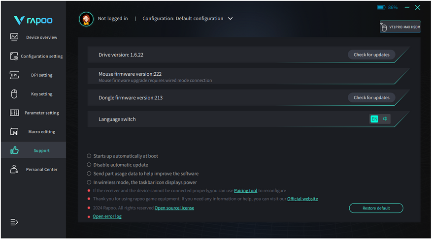 На мыши Rapoo VT1Pro Max с сенсором PAW3950 можно активировать частоту опроса 8000 Гц. Согласно инструкции необходимо выставить 1600 DPI и в специальной утилите откроется доступ к функции. Посмотрим что за программа.