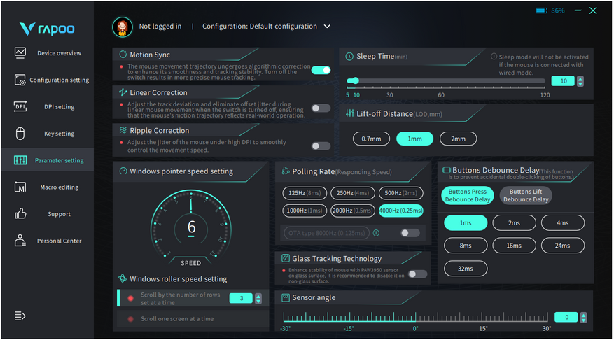 Вкладка «Key setting» позволяет перепрограммировать кнопки и задать новые действия. Во вкладке «Parameter setting» производится наиболее гибкая настройка: можно задать высоту отрыва, частоту опроса, время до перехода в сон, алгоритмы сглаживания и коррекции движения и много другое. Программа не русифицирована, поэтому потребуется помощь перевода для понимания некоторых опций.