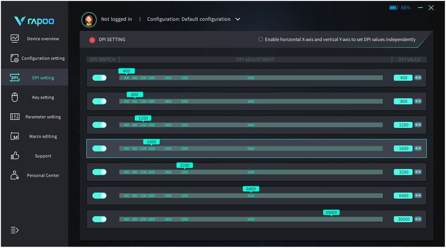 В памяти Rapoo VT1Pro Max хранится до семи состояний с разным разрешением сенсора. По умолчанию сенсор PAW3950 поддерживает значение DPI до 30000, но в настройках его можно «увеличить» до 42000. Лишние режимы можно отключить, оставив необходимое количество. Удобно, например, я использую только «базовые» 1600 DPI и «разогнанные» 3200 DPI: для работы и игр соответственно.