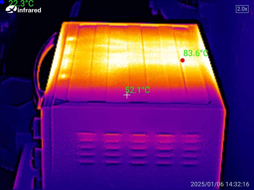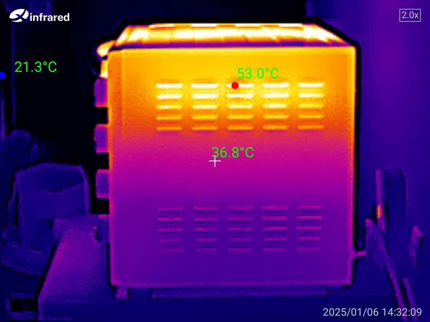 У корпуса практически нет теплоизоляции, поэтому он сильно нагревается. Сверху ставить во время готовки категорически ничего нельзя, а также нельзя ставить рядом с теми предметами, которые могут испортиться от высокой температуры. Фотографии тепловизором были сделаны спустя один час готовки на включенном верхнем ТЭНе при температуре 250℃. Если включить нижний ТЭН, то корпус также прогревается, как и сверху.