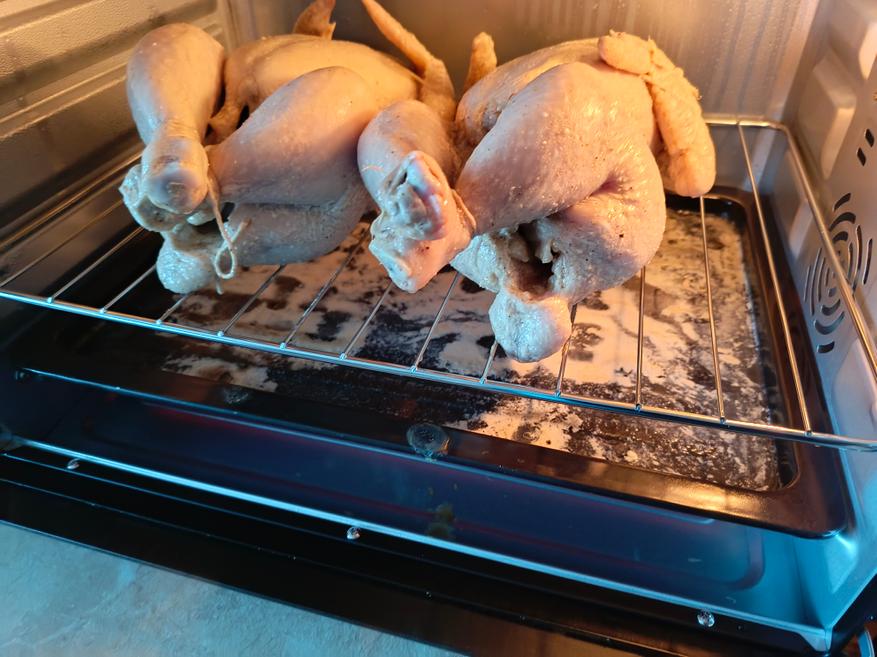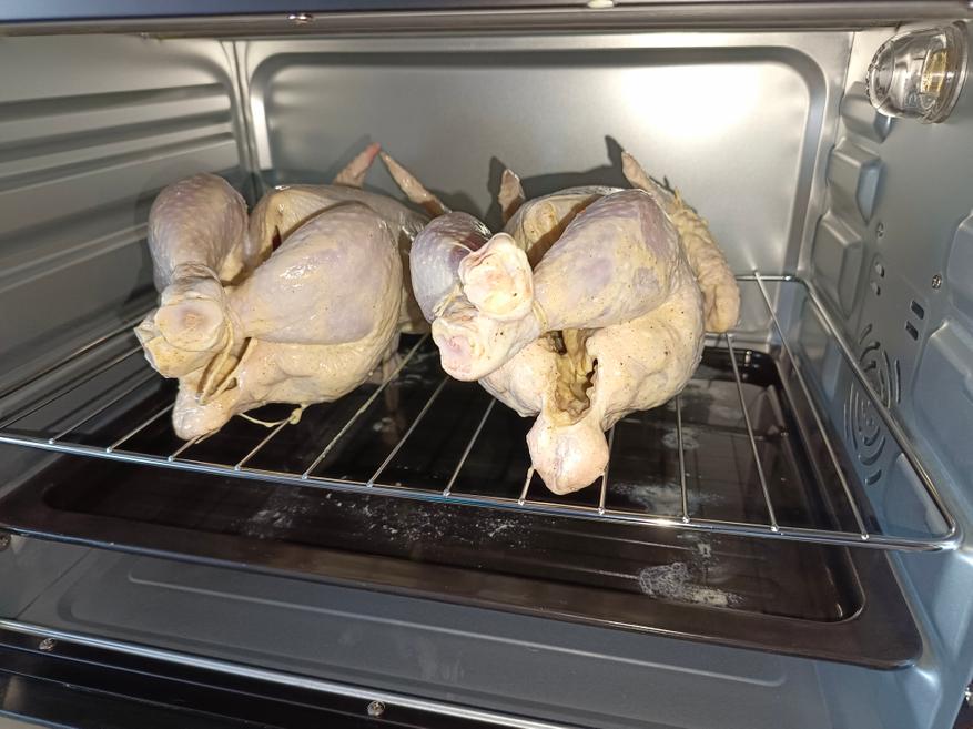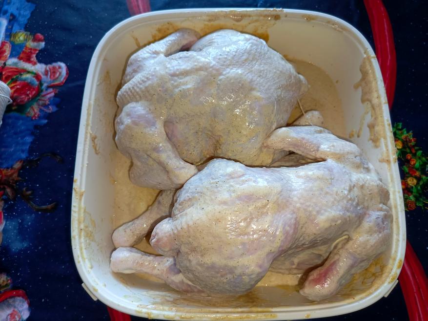 Для готовки я взял две курицы, вес каждой около 1,5 килограмма. Предварительно курицу замариновал в майонезе с горчицей. Из специй использовал только соль и перец. Соль 20 грамм на килограмм, перец по вкусу.