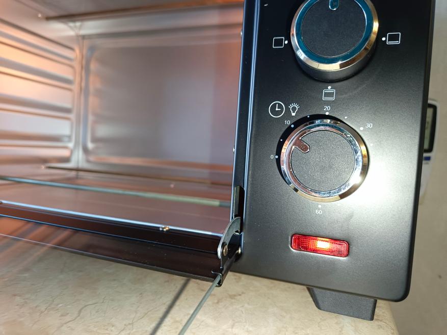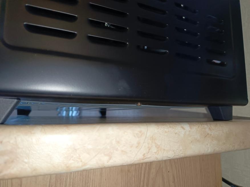 Весь корпус расположился на высоких ножках, которые подымают мини-печку вверх, чтобы не греть столешницу. Также предусмотрены упоры на задней части корпуса, чтобы вы не смогли придвинуть вплотную мини-печь к стенке.