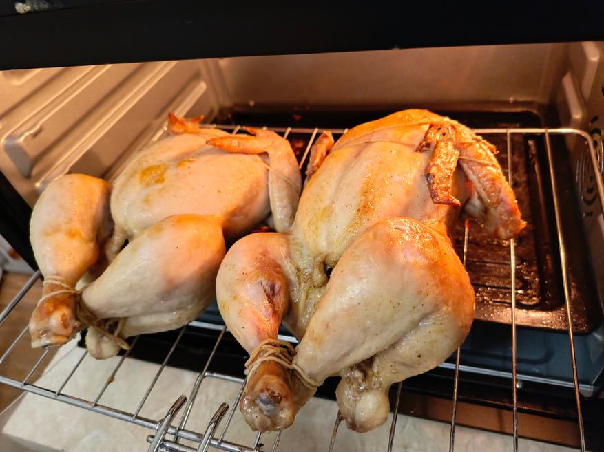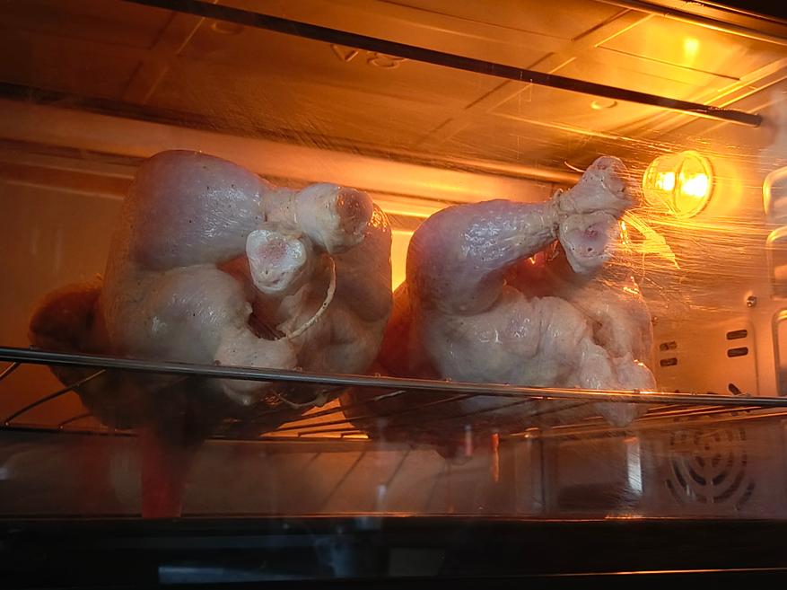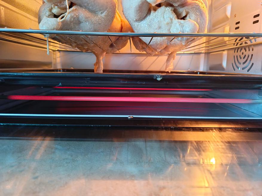 Сначала я готовил только на нижнем ТЭНе один час. Спустя это время курица покрылась корочкой, тем самым запечатав все соки внутри себя. Второй час уже готовил на двух включенных ТЭНах, предварительно слив воду из противня. Во время готовки курицу нельзя двигать на решетке, чтобы не повредить кожицу. Если повредите, то все соки начнут моментально вытекать.