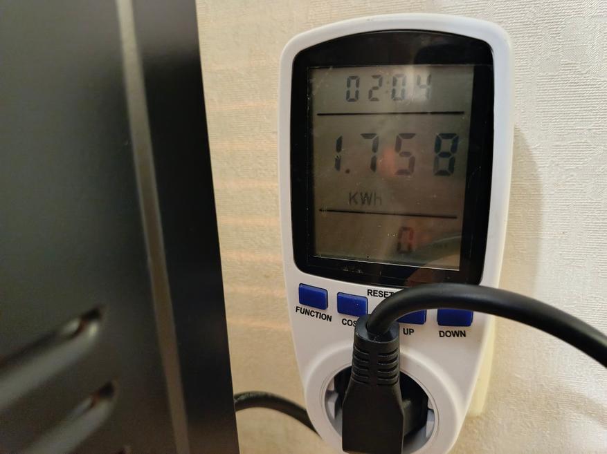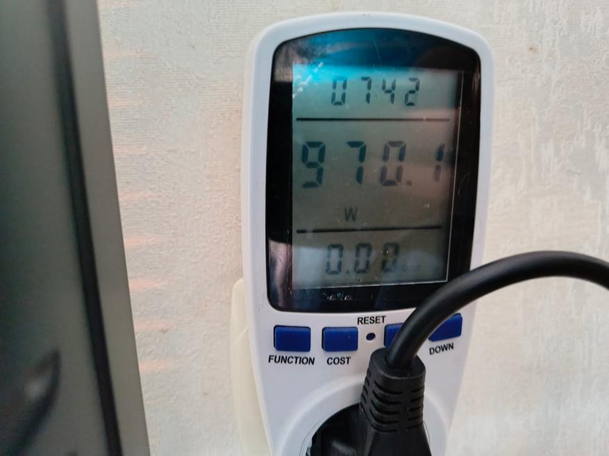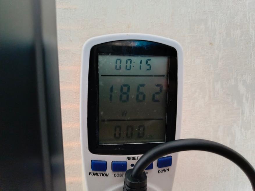 Начну с электропотребления. Если включить один нагревательный элемент, потребление около 970 Вт, если сразу два, то потребление возрастает до 1860 Вт. За два часа готовки, где первый час работал один ТЭН, а второй час работало сразу два нагревательных элемента, и за это время ваттметр зафиксировал показания в 1,7 кВт. По деньгам это около 10 рублей, поэтому если очень часто будете готовить на этой электропечи, то готовьтесь платить за свет.