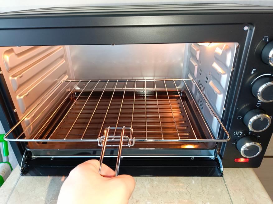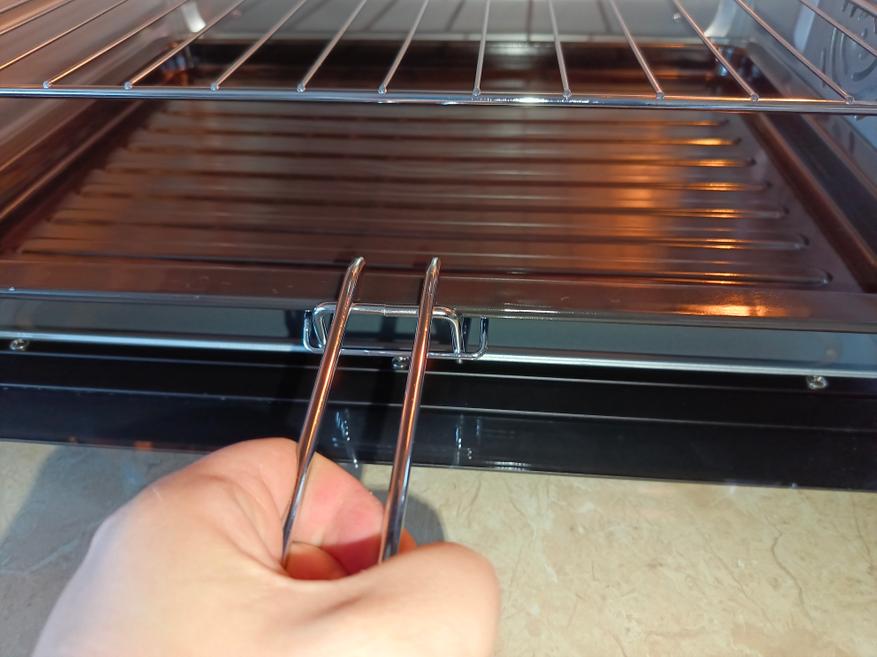 В комплекте к противню и решетки есть ручка, которая позволит их выдвинуть. Если установлено что-то легкое, то можно и вытащить сразу. К примеру, печенья, а, например, пару килограмм мяса лучше уже выдвинуть этой рукояткой и взять уже ваше блюдо термостойкими варежками.