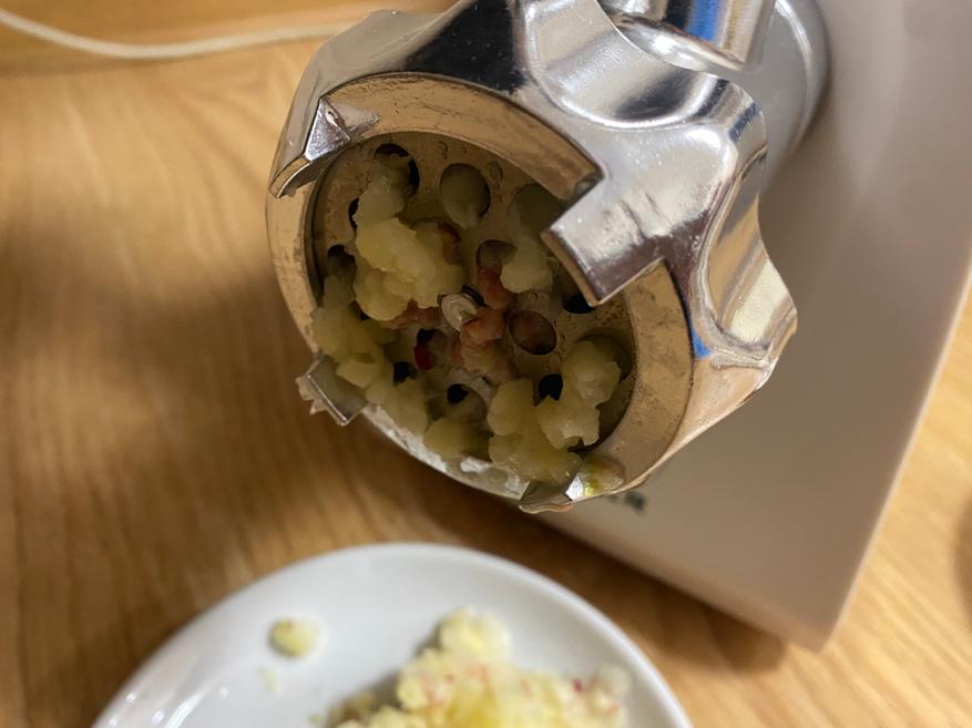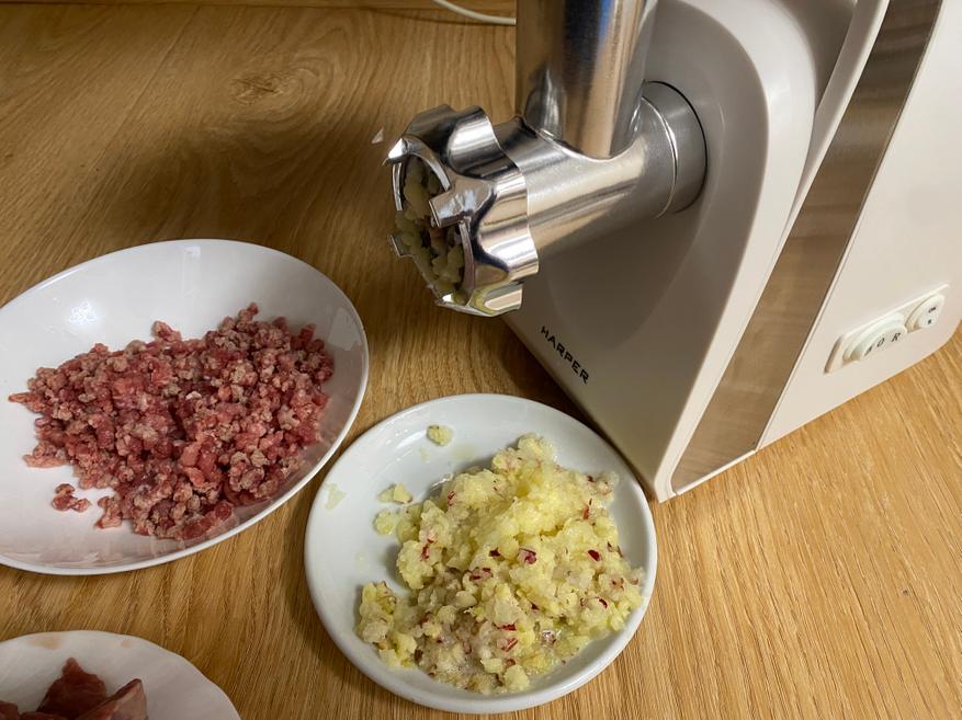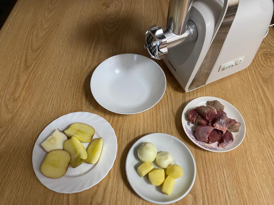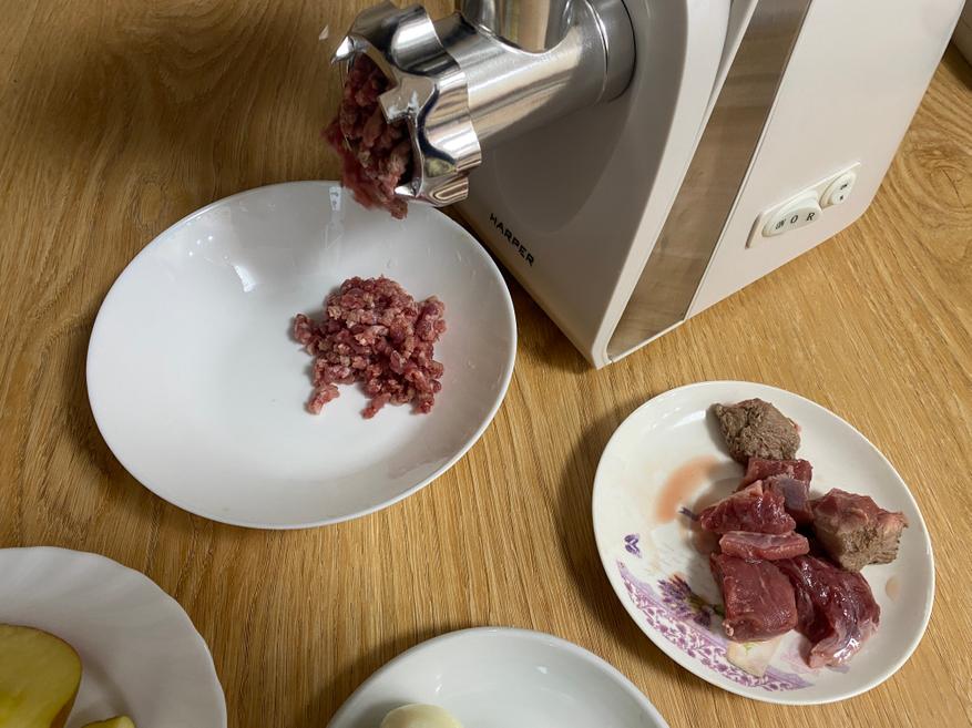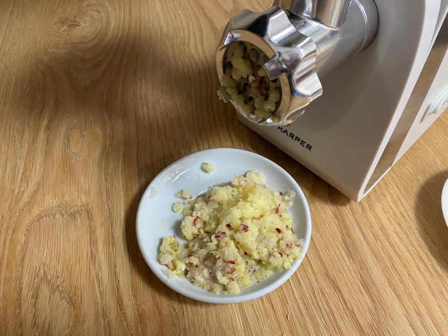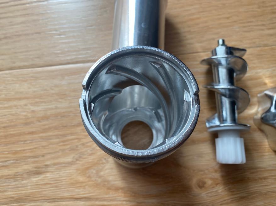 Для тестирования мясорубки использовалось говяжья мякоть, картошка, лук, яблоки. Сразу хочу отметить, что все продукты мясорубка перемолола за считанные секунды. Перед использованием мясорубки стоит учесть, что сам вал мотора сделан из металла, а вот сами передающие шестерни сделаны из пластика и при заклинивания шнека скорее всего металлические зубья вала просто съедят зубья шестерни. Это чаще всего происходит из-за отсутствия защиты от заклинивания шнека. Чтобы данная поломка не возникала производитель запрещает перемалывать мясные куски с косточками, плохо размороженные продукты. Если придерживаться рекомендациям производителя, то никаких поломок возникнуть недолжно.