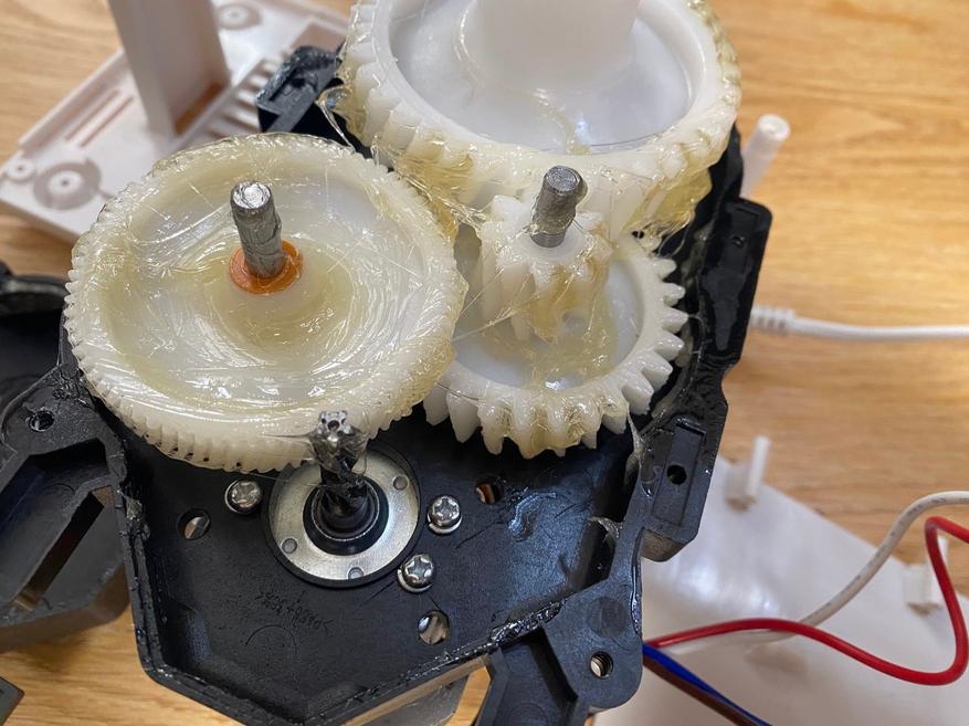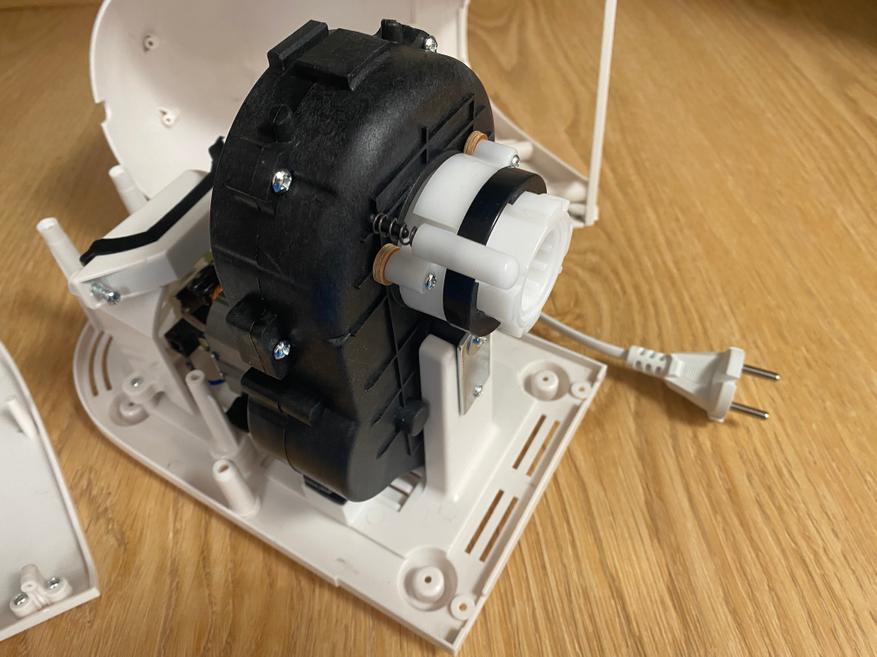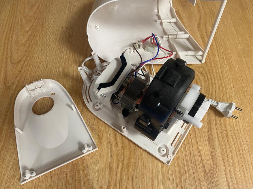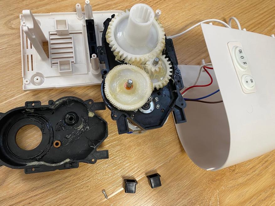 Мясорубка разбирается достаточно просто и для полного разбора нам понадобится только крестовая отвертка. Откручиваем все корпусные винты и снимаем пластик. Конечно, сразу стало интересно какие шестерни стоят в редукторе и после открытия можем увидеть только пластиковые шестерни. При первом включении мясорубки был непонятный шум, но после открытия стало понятно откуда он исходит. Оказывается смазка была просто нанесена на корпус одной шестерни и попросту не использовалась. На фотографиях смазка присутствует во всех необходимых местах, как и должна быть (распределил уже самостоятельно). Так что после приобретения мясорубок лучше перепроверить данные моменты для предотвращения ненужных поломок. Со всеми компонентами внутреннего пространства мясорубки можете ознакомиться на фотография ниже.