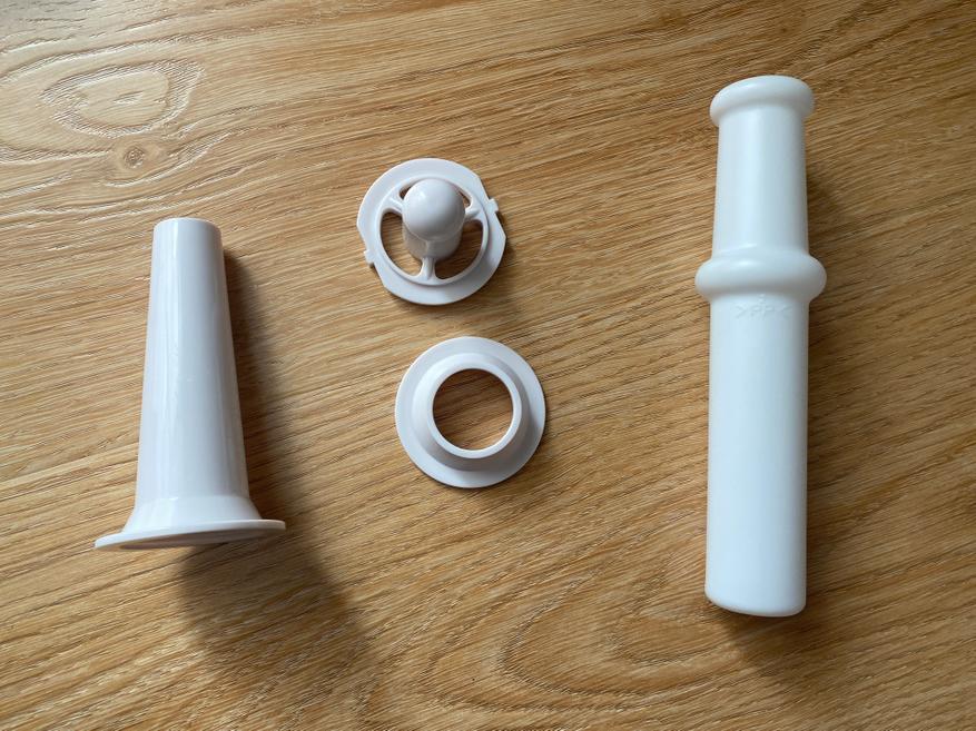 В комплект также входит три металлических диска с разным диаметром отверстий для формирования фарша. Также в комплекте имеются пластиковые насадки для приготовления кеббе и формирования домашних колбасок. Толкатель из набора изготовлен из пластика. Загрузочный лоток и корпус со шнеком сделаны из металла.