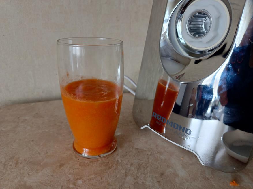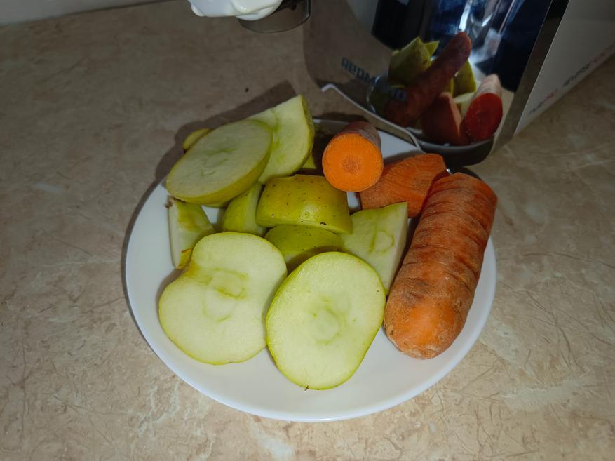 Сок выливается снизу насадки, а жмых выходит в передней части. Стаканчиков под сок и жмых в комплекте нет, поэтому приходится импровизировать. По звуку двигателя можно понять, что он не испытывает больших нагрузок как от яблок, так и от моркови. Из яблок получается пюре, а из моркови сок.