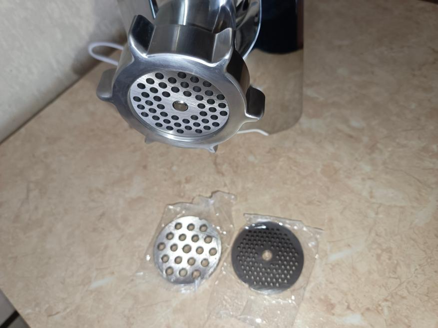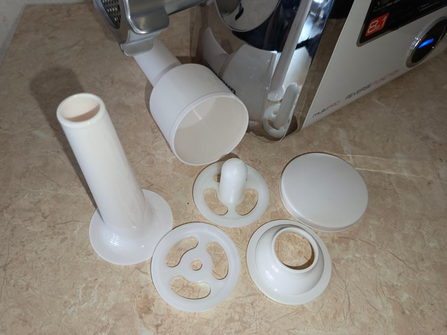 Хорошая комплектация, в том числе приятно, что есть насадки для колбасок или люля-кебаб. Я ими не пользовался, так как это стандартная форма насадок и у меня остались такие же насадки от старой мясорубки. Со своей задачей они справляются.